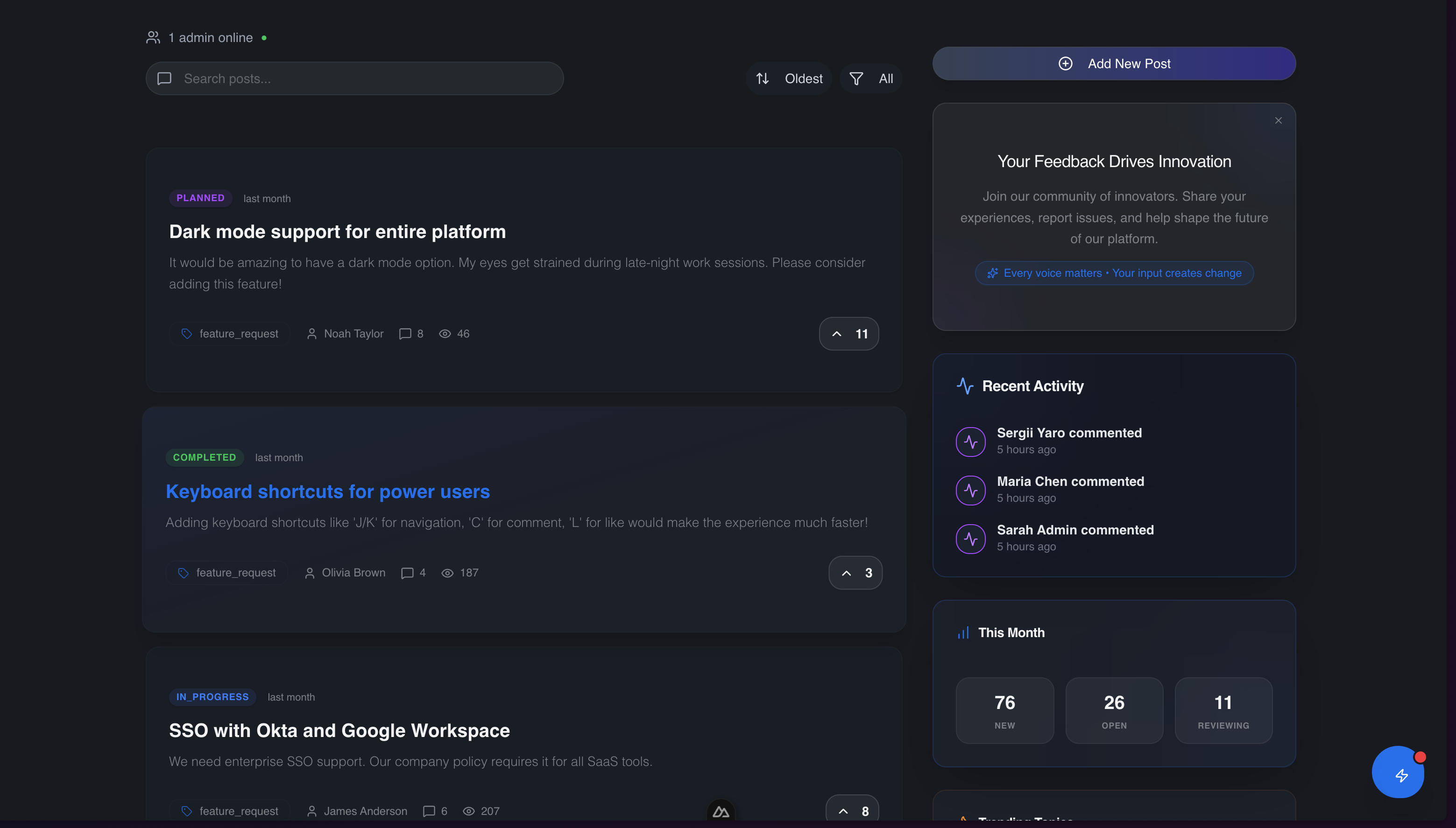 Show users in real-time when new posts, votes, comments, and status changes happen in your workspace. Everything is streamed to everyone online.